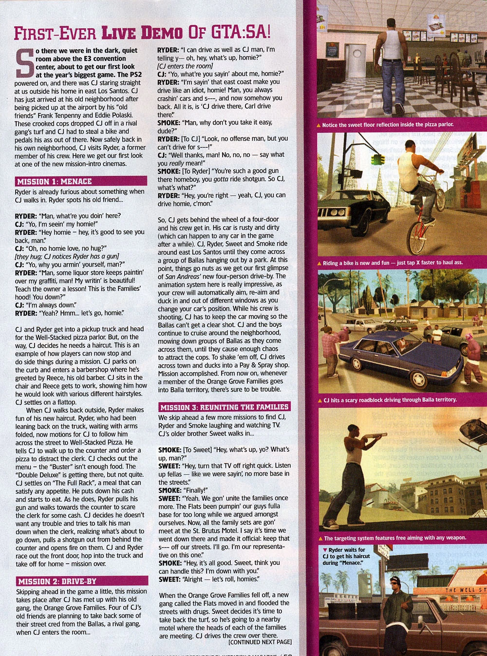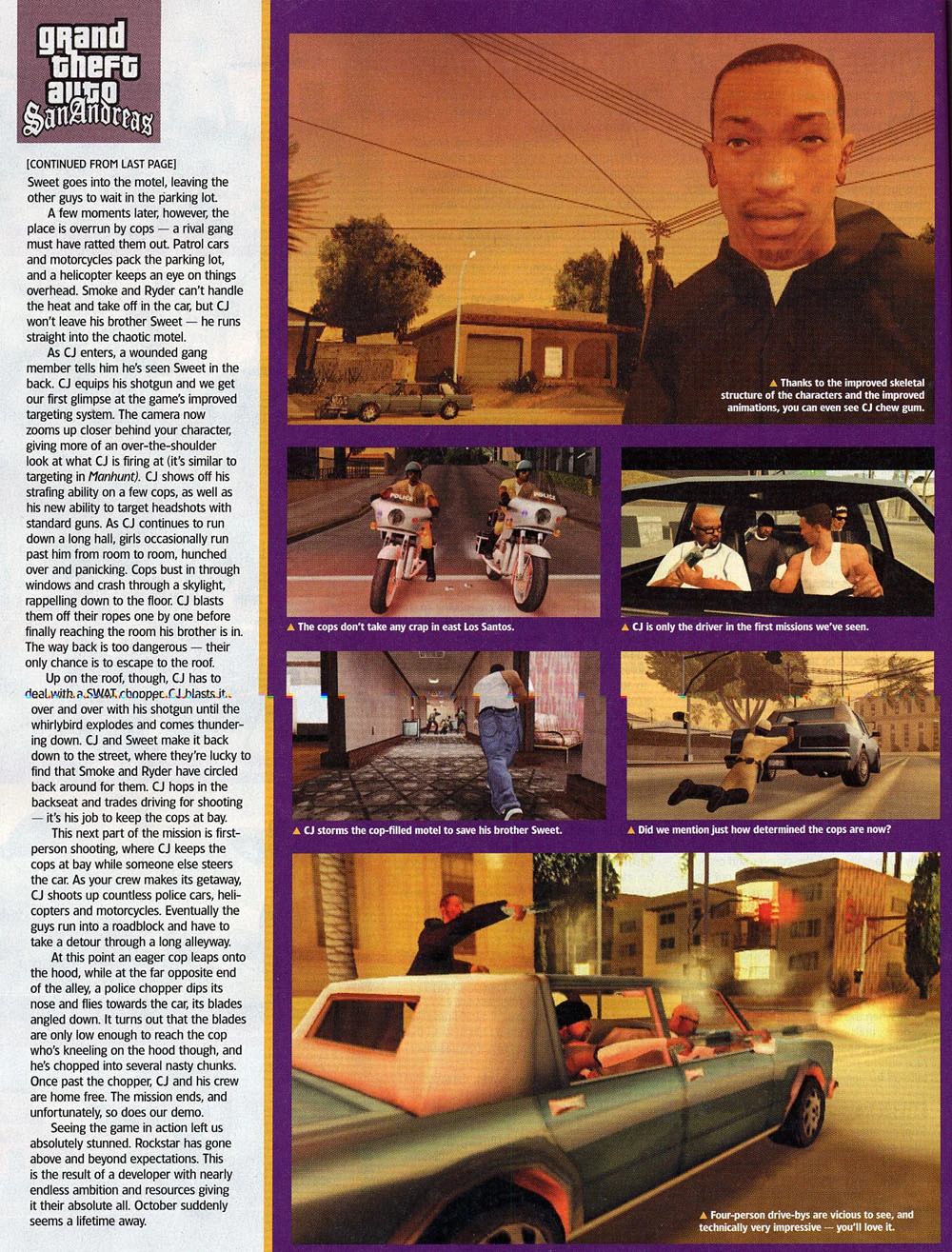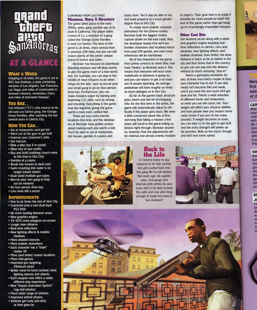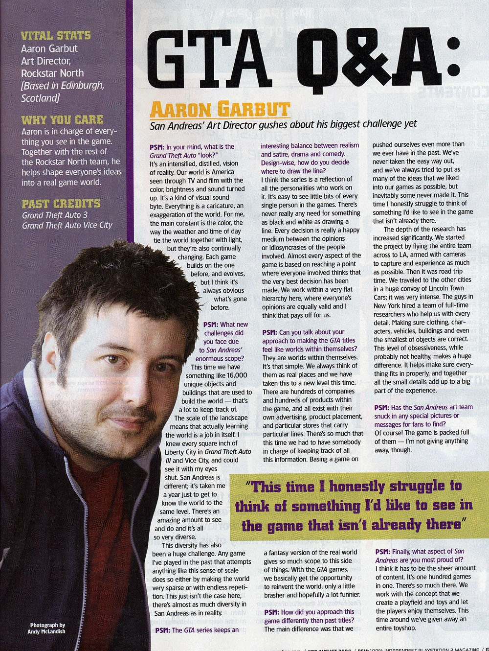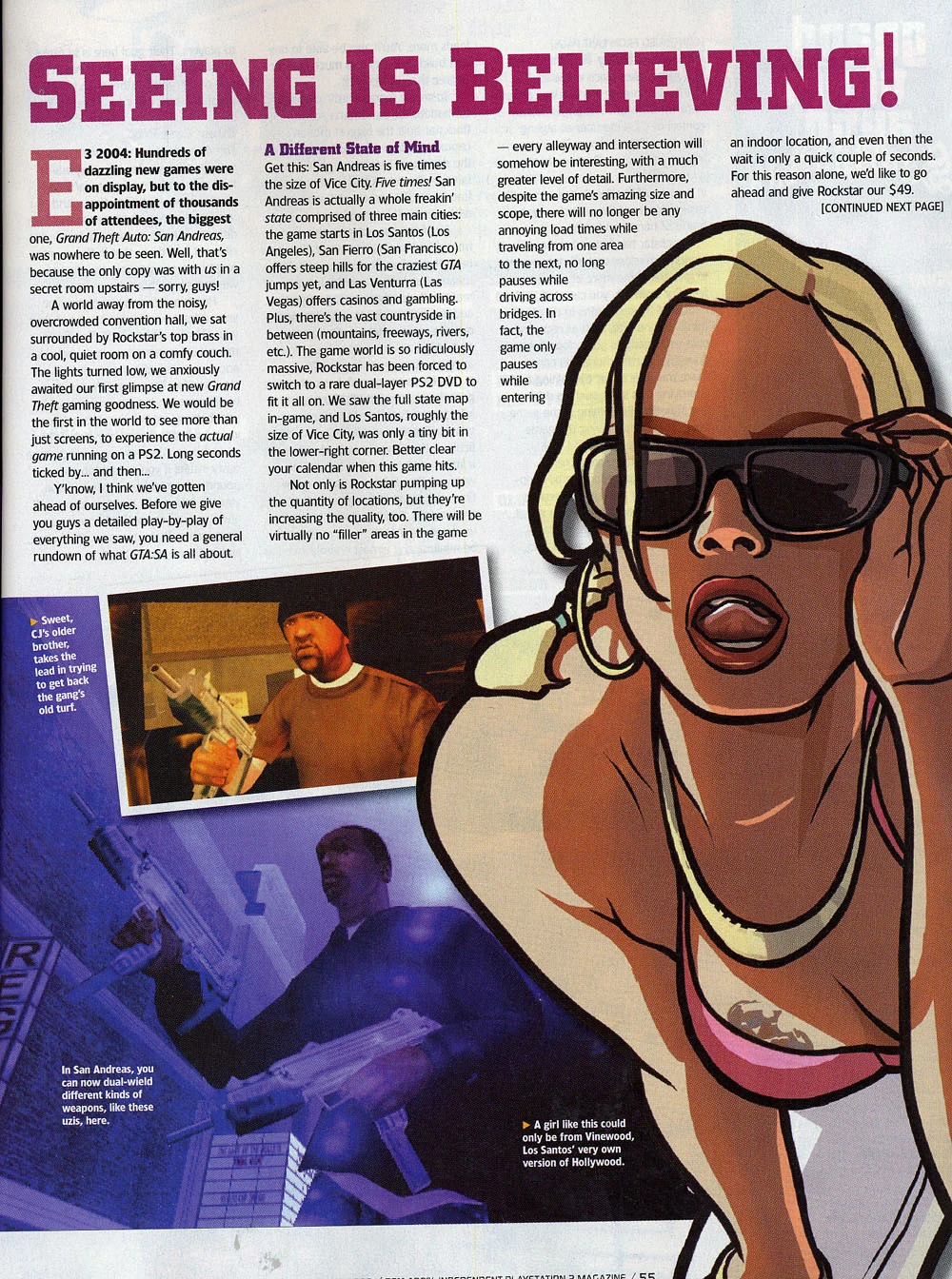 Con descripciones interesantes de lo que el equipo de PSM USA vio de la demo de GTA San Andreas en la E3 2004. Y además, una entrevista interesante a Aaron Garbut - Director de Arte de Rockstar North.